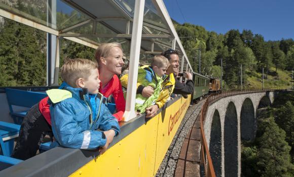 Bernina Express. Le train panoramique vous emmène au-dessus de viaducs, ainsi qu’à travers des paysages magnifiques, avec la traversée de cols et de montagnes jusqu’à Tirano en Italie. Le